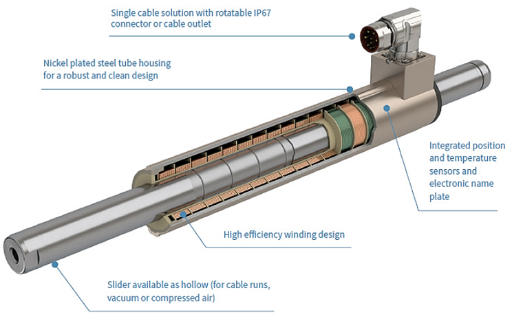 Kraftfulde sjældne jordartsmagneter i skyderen og viklinger i statoren anvendes til direkte at generere den lineære bevægelse.