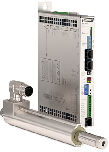 Integreret servodrev, som du kan konfigurere via PLC med fuldautomatisk konfiguration af motordata og idriftsætte med et klik. LinMot-drev har alle standard fieldbus-interface for tilslutning til et overordnet styringssystem.