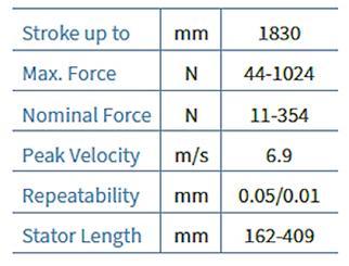 LinMot P01-lineærmotorer er permanentaktiverede, jernløse synkrone servomotorer med integreret positionsmåling og overbelast-ningsbeskyttelse. Seriens designkrav er: Høj effekt-tæthed, ekstrem effektivitet, lav støj, glat drift og længere levetid. Serien omfatter standard- (Universal), HP (High Performance) og “Short” (kompakt) versioner.